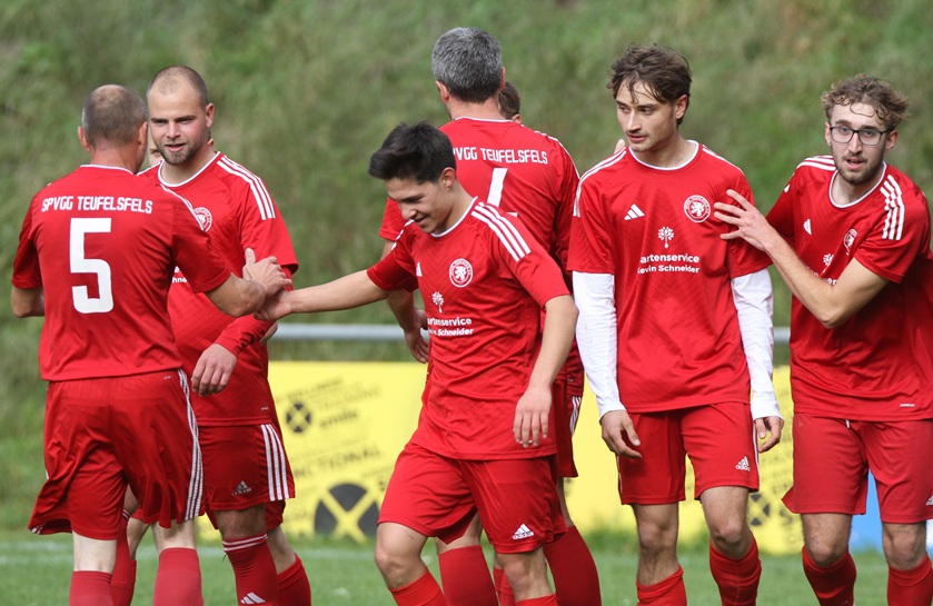 Teufelsfels siegt 4:2 und die Verfolger patzen Am 12.Spieltag der B-Klasse empfing der Tabellenführer den Vorletzten TV Grumbach Mit einem fein herausgespielten 4:0-Erfolg hatte die Elf der Spvgg. Teufelsfels am 10.Spieltag die Tabellenspitze in der B-Klasse Birkenfeld 1 übernommen und den TuS Breitenthal (nur 1:1 in Veitsrodt) auf Platz zwei abgedrängt. Dann ging es zur 2. Mannschaft des Bollenbacher SV, die Tabellen-10 war - und mit 10:0 geschlagen wurde. Am nun anstehenden 12. Spieltag kam der aktuelle Vorletzte TV Grumbach zum Spitzenreiter. Der TVG hatte erst ein Spiel (am 3. Spieltag mit 6:2 gegen SG Bergen/Berschweiler) gewonnen. Teufelsfels hatte es nicht ganz leicht, am Ende mit 4:2 den Dreier unter Dach und Fach zu bringen. Foto: Joachim Hähn.