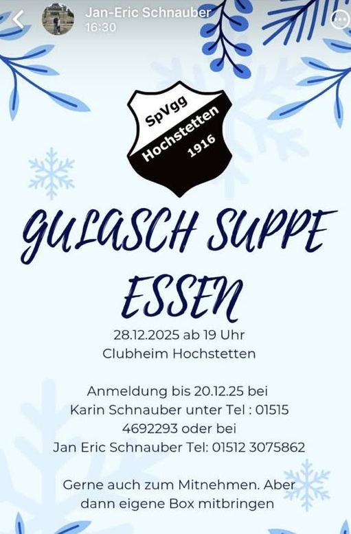 SV MeckenbachDie Boule-Vereinsmeisterschaft des SV Meckenbachfindet am 01.11.2025 statt. Spielberechtigt sind alle Mitglieder. Spielmodus: Es wird Tete á Tete gespielt. Anmeldung bei Abteilungsleiter Klaus-Dieter Schlarb, Tel. 06752 5026, bis 25.10.2024.