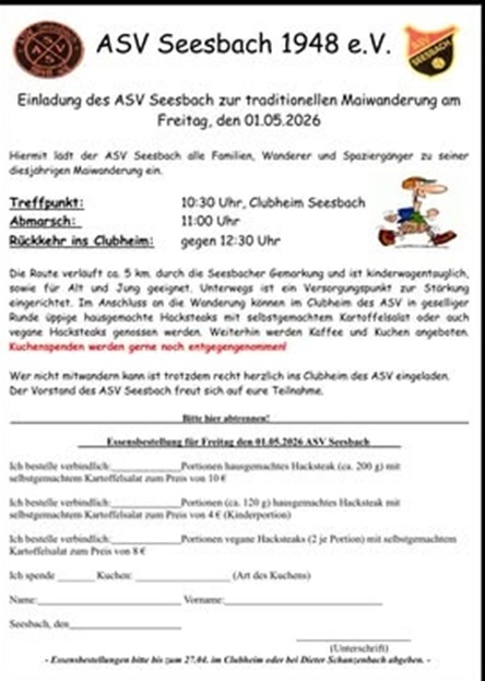 Angel - und Umweltschutzverein "Forelle" Kirn-Sulzbach * https://asv-forelle.de Haxenessen am 16. September 2023Der Angel- und Umweltschutzverein veranstaltet sein traditionelles Spansauessen (oder Jägerhacksteak) in der "Alten Schule" in Kirn-Sulzbach. Anmeldungen bis 10. September bei Pia Schmidt, Tel.: 06752 5206, 0172 685 5827, E-Mail: |